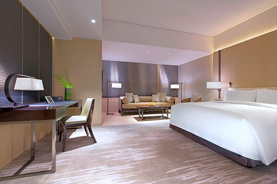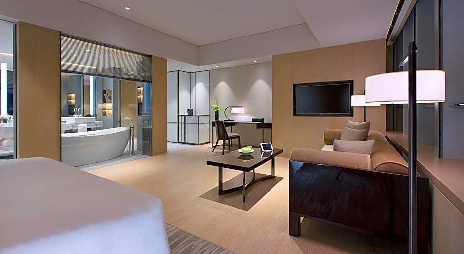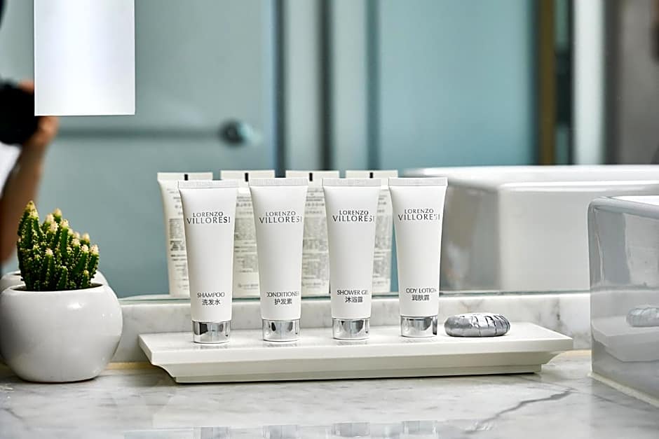 This room is located between the 9th and the 25th floors, offering optimal views of Da Ci Temple and commercial district. With discreetly screened windows, the bathroom with a bathtub and intimate vanity area receives an abundance of natural light. It also comes with 500 thread-count linen sheets, customized Italian-branded bathroom amenities and toweling. Guests can enjoy daily complimentary soft drinks in the guestroom mini bar (excluding imported mineral/sparkling water).