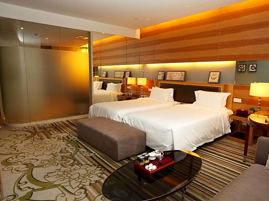 Located on 36th-42nd floors, this twin room features a seating area, soundproofing, air conditioning, floor-to-ceiling windows, electric curtains and French furniture. The bathroom offers rain shower and embedded LCD TV. Room rate includes Executive Lounge benefits including: - Breakfast in Executive Lounge from 7:00-10:00 - Afternoon tea from 14:00 to17:00 - Cocktail party from 18:30 to 20:30 - Free use of the meeting room (maximum 8 people) in Executive Lounge for 2 hours (reservation is needed) - Free use of internet for 2 hours in Executive Lounge - Free laundry service worth CNY 50 per night (this service cannot be accumulated) - Late check-out until 18:00 (subject to availability) - Free coffee and tea offered in the lobby lounge from 07:00-23:00 - welcome fruit and goodnight milk; - free 2 pieces of wet laundry and mini-bar 50 CNY credit per day for guests who stay 2 consecutive nights; - free 2 pieces of wet laundry, mini-bar 50 CNY credit per day and one guest enjoying buffet dinner for guests who stay 3 consecutive nights.
