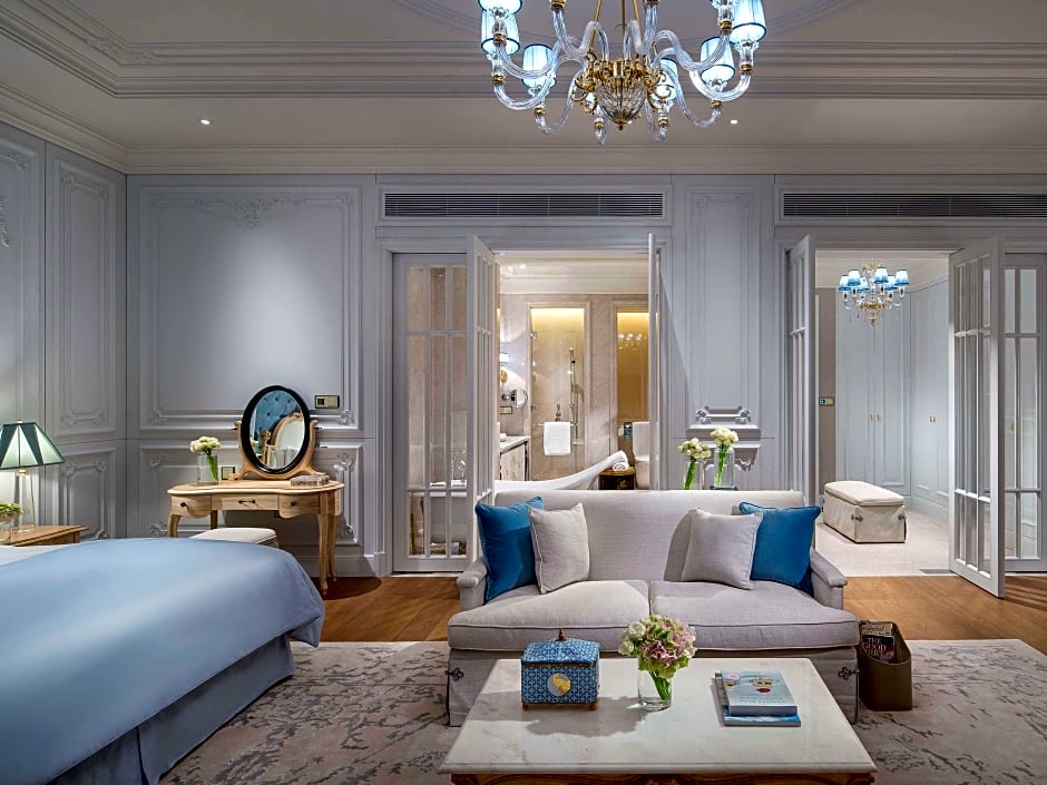 The hotel offers various types of rooms, including Luxury King, Superior King, Luxury Room Club Millesime, Junior Suite, Prestige Suite, Luxury Premium Chinese Style, Superior Twin, Luxury Premium French Style, Luxury Premium Modern Style, and Luxury Twin rooms. All rooms are non-smoking and can accommodate 2 adults and 1 child. The rooms have different sizes ranging from 484 sqft to 1313 sqft. The beds in most rooms are King size, except for the Superior Twin room which has 2 Twin beds.