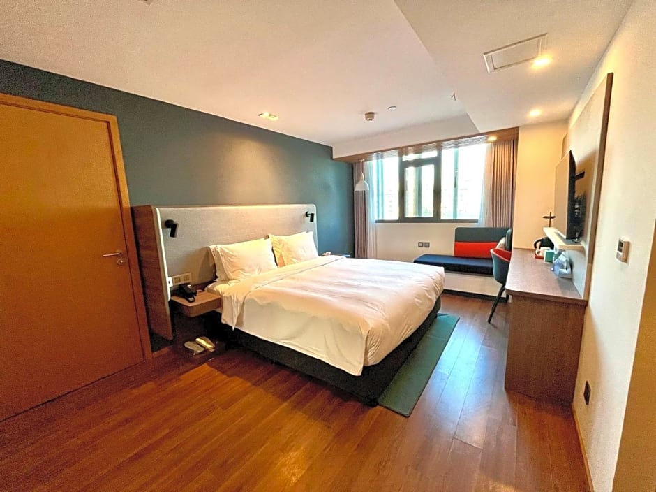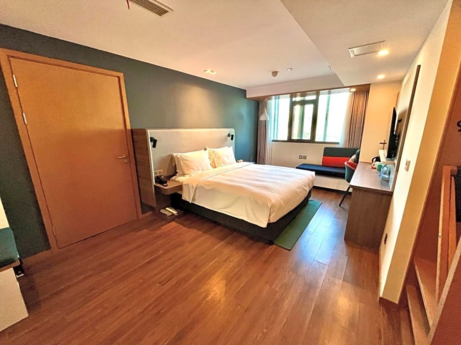 Guest rooms feature extra-long beds (>6.5 ft), soundproofing, free toiletries, and a kid-friendly buffet, designed to make families and light sleepers comfortable.
