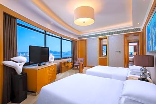 Available rooms at Four Points by Sheraton Hainan, Sanya include guest rooms with ocean or city views, ranging in size from 377 sqft to 969 sqft. There are double rooms with either a king-size bed or two twin beds, accommodating up to 3 adults and 2 children. Suite options include a full ocean view family suite with two king beds, a two-bedroom family ocean suite, and a hospitality suite, all accommodating larger groups with additional amenities. Smoking is not allowed in any of the rooms.