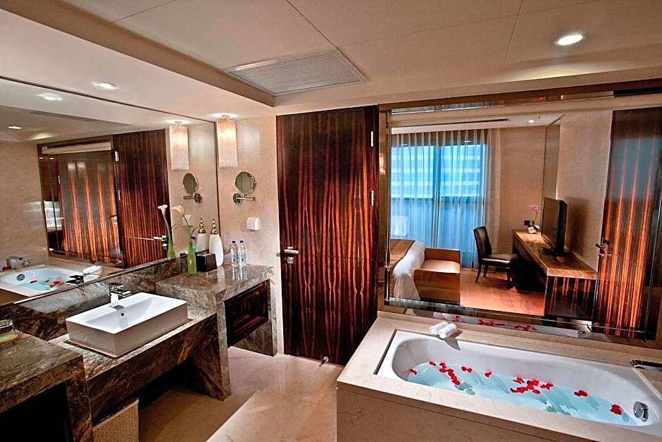 The hotel has three restaurants on site: Jin Mei Hua Garden, offering traditional Chinese cuisine and a family-friendly ambiance; Spices Cafe, serving American cuisine with a modern and romantic ambiance; and the Lobby Lounge, providing a modern and romantic atmosphere.