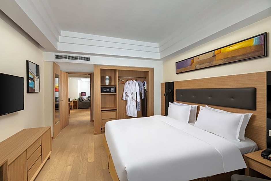 The hotel offers a variety of rooms including standard and premium options, as well as suites with separate living areas and additional space. The rooms can accommodate 2 adults and 1 child, with bed sizes ranging from twin beds to king-size beds. Smoking is not allowed in any of the rooms, and the sizes range from 291 sqft to 700 sqft.