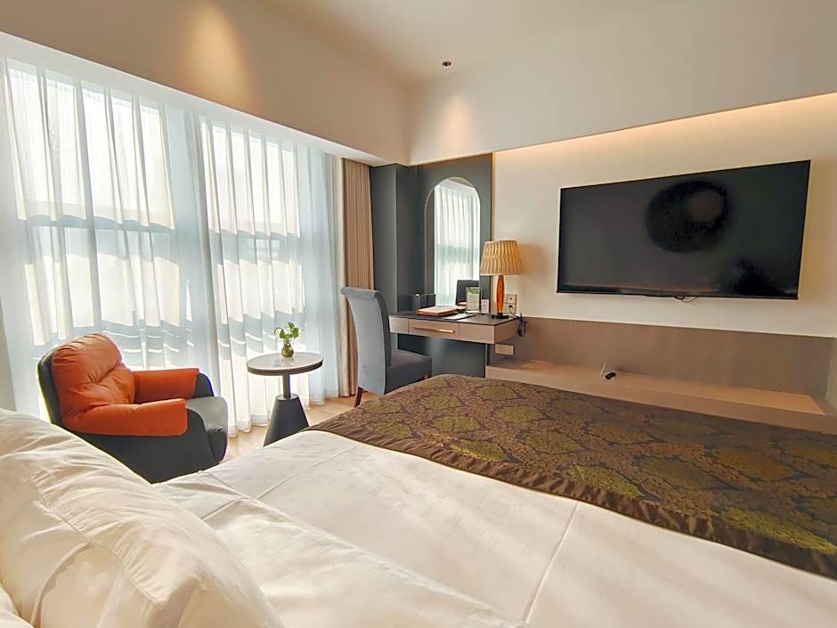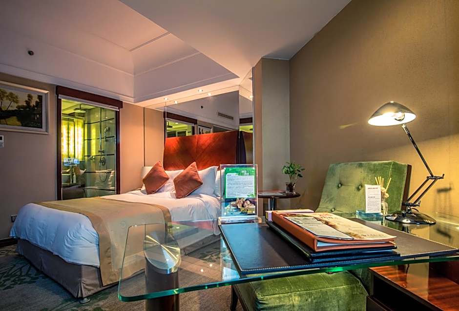 At Merry Hotel Shanghai, guests can choose from a variety of rooms like the Enjoy Executive King Room with a queen-size bed, the Business Twin Room with two twin beds, and the Executive Room with a queen-size bed. All rooms accommodate 2 adults and 1 child, have a size ranging from 215 to 323 sqft, and do not allow smoking.
