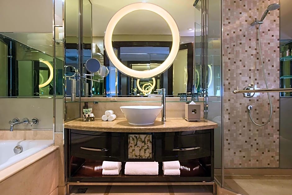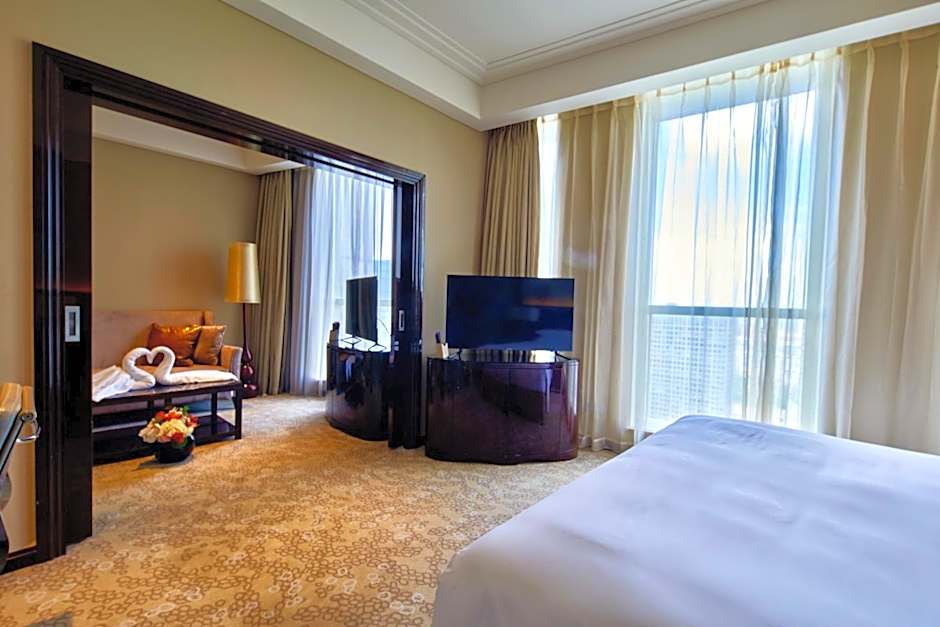 Spacious suite features a separate living room and a bedroom. It comes with a 25-inch flat-screen TV, a work desk, an electric kettle, a coffee maker, a personal safe and an attached bathroom with a bathtub. Guests are entitled to enjoy Club Lounge privileges including: - Free internet access in the room - Free food: continental breakfast, snacks, hors d'oeuvres, desserts - Free Cocktails, nonalcoholic beverages, free business services - 50% discount on laundry, dry cleaning or pressing services