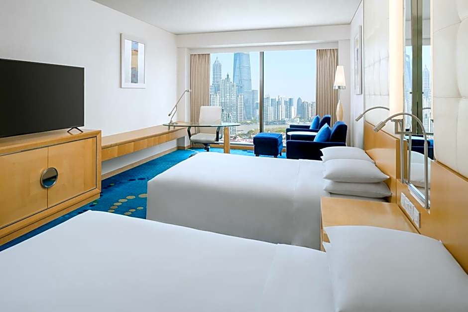 Bund View Twin Room (2 Double Beds) is 323 square feet and includes a double bed 131-150 width plus desk, satellite tv , bathrobes, and slippers.