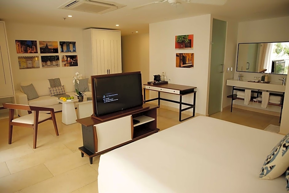 Elevated above the bustle, the rooftop outdoor pool beckons with a shallow end and sweeping city views. A sun deck, terrace, and balcony areas offer plenty of space to soak up Cartagena’s sunshine or unwind with a drink as the evening light fades.