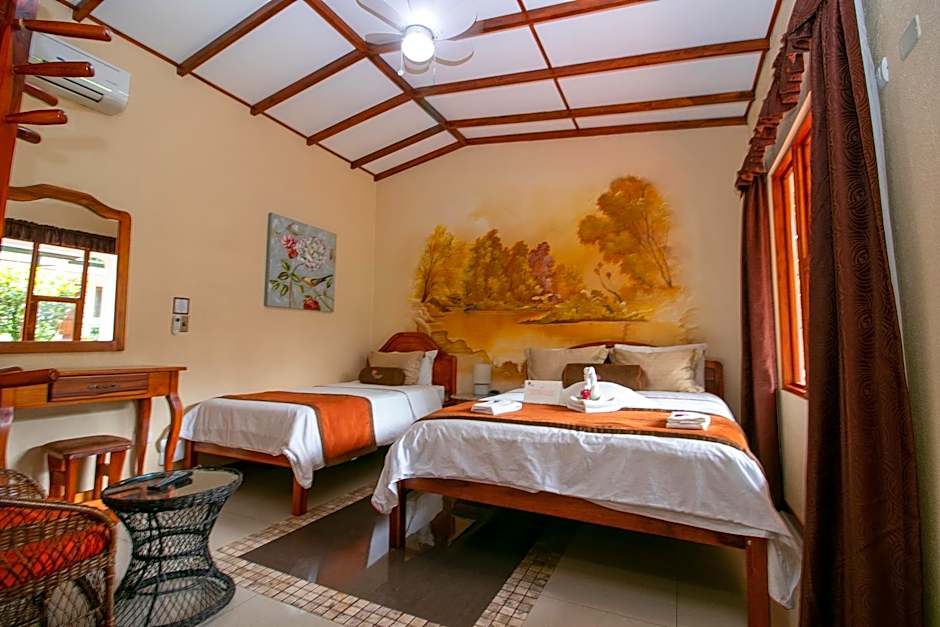 This room features a queen and a single handmade hardwood bed. Some of the private bathrooms in these rooms have a bath. Air conditioning is included, as well as free WiFi, beautiful Costa Rican artwork, TV set, plush towels, high quality imported bedding, and orthopedic mattresses.