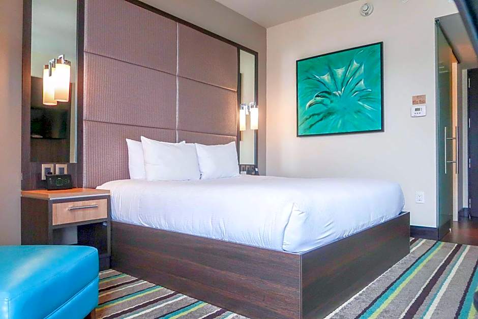 40-inch TV, work desk, ergonomic chair, mini-fridge, complimentary WiFi This mobility accessible standard room features one king-sized bed, and a roll-in shower. This room offers the latest in technology and ergonomic comfort to our guests. Roll-in shower with attached accessible seating, lowered vanity in bathroom, and lowered shelf in closet. Relax in this stylish approximate 36 square feet one King Bed Room. Enjoy a restful night's sleep in the luxurious Suite Dreams® by Serta bed. Work in comfort at the desk with ergonomic chair. Watch a program on the 40 inch LCD TV or surf the web with complimentary WiFi access. This room also features a mini-fridge and coffeemaker. Any corresponding photo may not reflect the specific accessible room type or room feature.