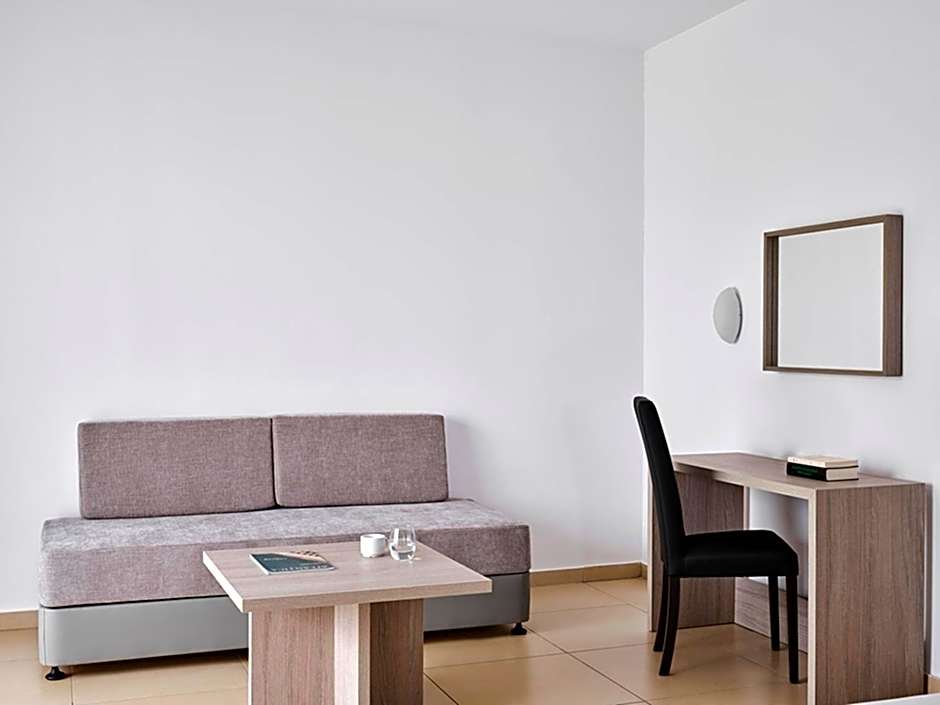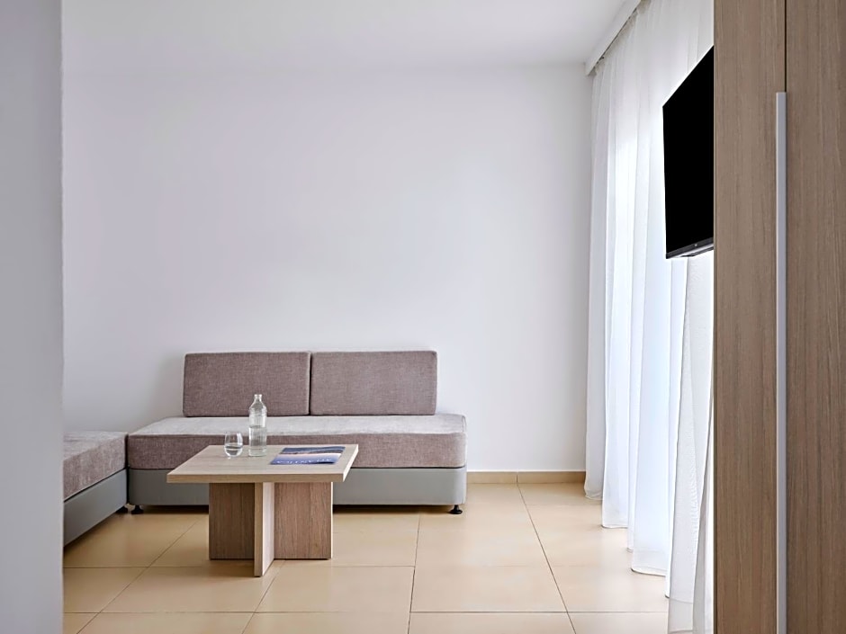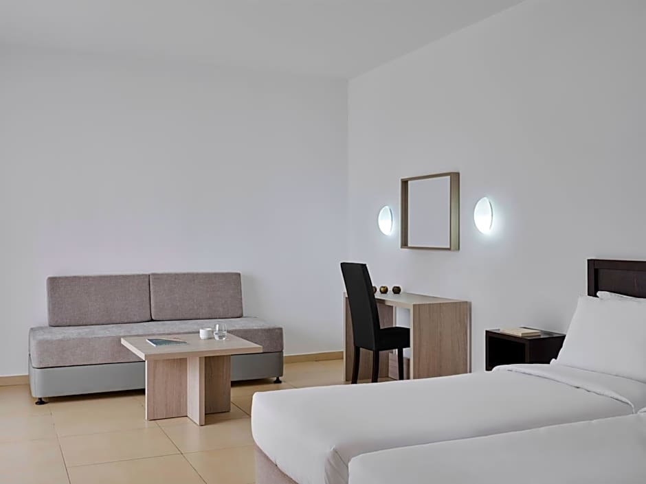 At Atlantica Callisto hotel, guests can choose from Studio Garden View, Studio Side Sea View, One Bedroom Sea View, One Bedroom Pool View, and One Bedroom Garden View rooms. These rooms vary in size from 398 to 452 sqft and accommodate up to 3 adults. Smoking is not allowed in any of these rooms, and bed options include Queen, King, Twin, and Sofa beds.