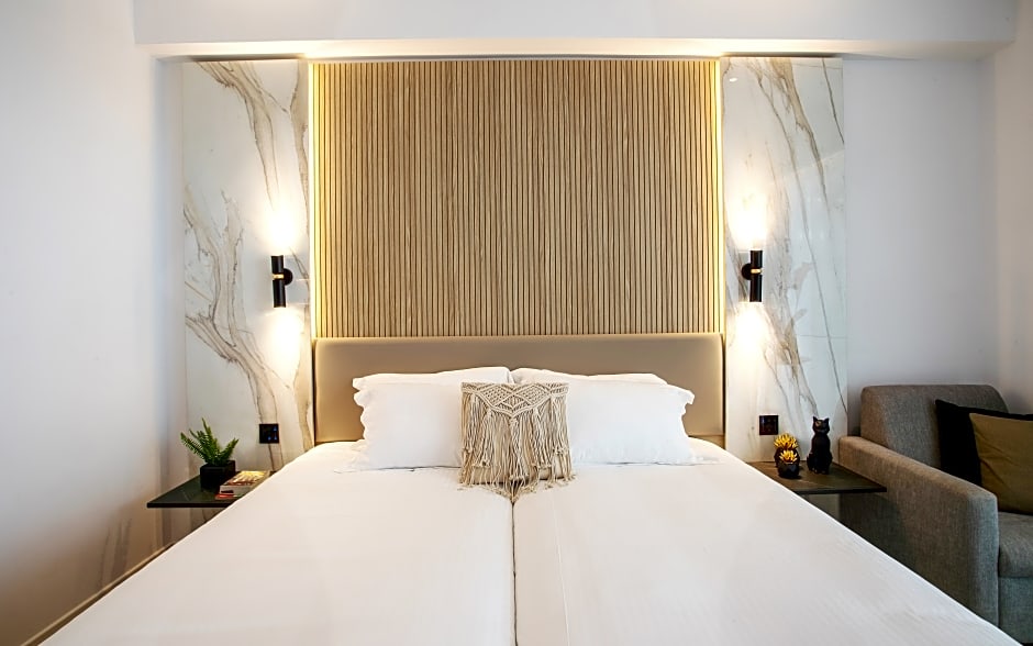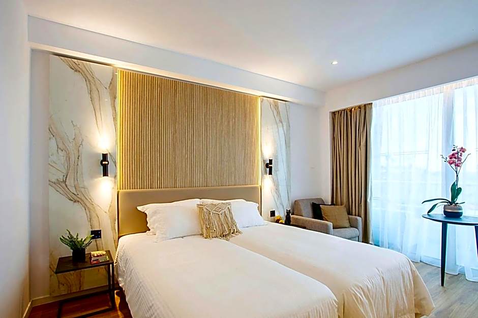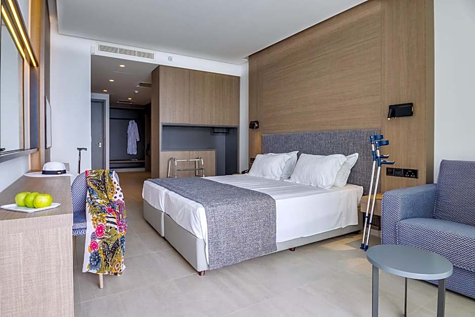 The hotel offers a variety of rooms, including standard rooms, family rooms, and suites. Occupancy ranges from single to quadruple, with some rooms having sea views. Room sizes vary, with double rooms typically offering queen or twin beds. Smoking is not allowed in any of the rooms.