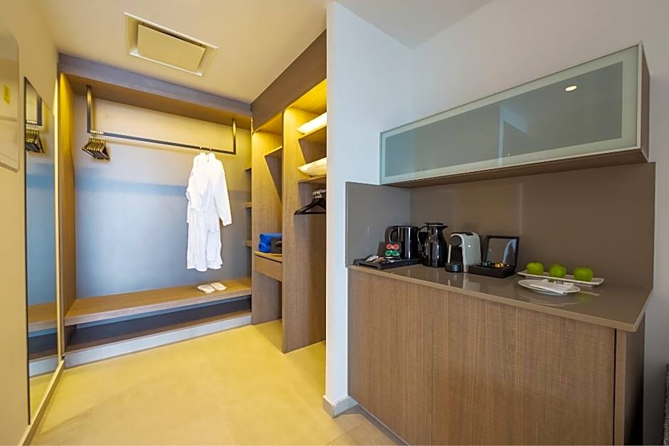 The hotel offers several on-site dining options: Alkion Restaurant serving International cuisine, Taverna offering Greek dishes, Coral specializing in Grill BBQ, Seaweed Sushi Bar for Japanese cuisine, Stone Grill Restaurant with International menu, Argo serving International dishes, To Kafeneion featuring Greek cuisine, and To Kyma Seaside Cafe for casual dining. The various restaurants cater to different tastes and preferences, providing guests with a diverse selection of food options without having to leave the premises.