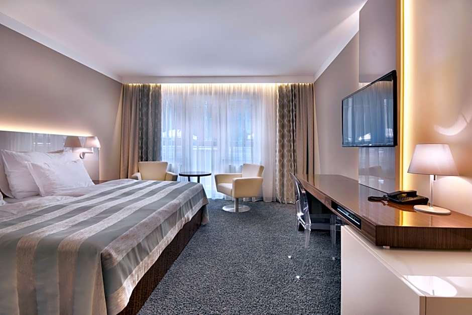 This air-conditioned double room has a mini-bar, a safe, a telephone and satellite flat-screen TV. The bathroom is fitted with a shower or a bath and a hairdryer. On arrival, guests receive a welcome drink. They can also benefit from free entrance to the wellness Center (swimming pool and fitness daily 9:00-21:00, saunaland – steam cabin, tepidarium, Finnish sauna, aroma sauna Mo-Fr 15:00-21:00, Sa-Su 9:00-21:00).