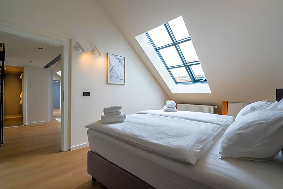 HONEST Karlin offers a rich mix of studios and apartments for flexible stays. The Studio Loft is about 237 sqft and sleeps 2 adults and 1 child, with a queen-size bed; the Studio Loft Attic, Double is 248 sqft and also accommodates 2 adults and 1 child with a double bed. For more space, the Superior Studio, Double includes a queen-size bed, while the Comfort Apartment spans around 312 sqft with a queen-size bed.