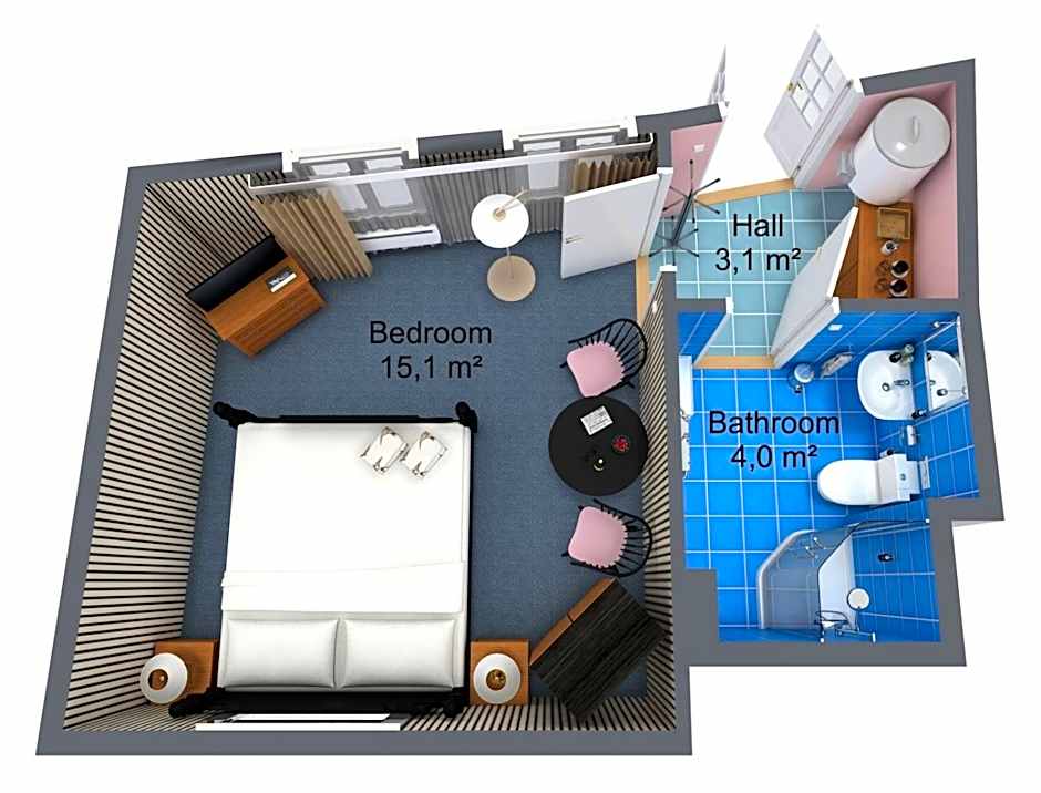 Located on the ground floor or in the mezzanine, the room has a double bed and a sofa bed, TV, refrigerator, electric kettle, shower or bathtub, towels, toilet paper, shower gel, wardrobe, heating, tea and coffee set.