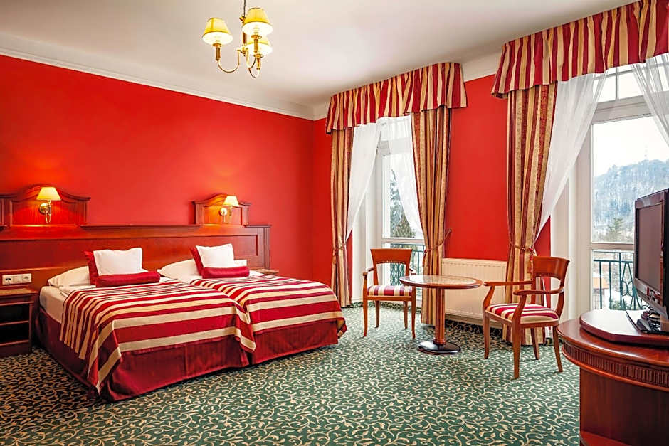Spa Hotel Imperial ist ein 5-Sterne-Refugium in Karlovy Vary, Tschechien, und liegt etwa 1,1mi vom Stadtzentrum entfernt. Adresse: Libuina 1212/18. Das Hotel bietet Frühstück für Gäste und sorgt so für einen genussvollen Start in den Tag.