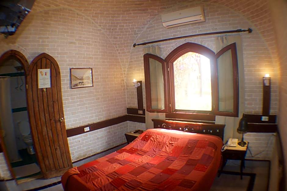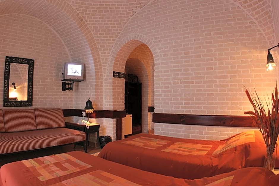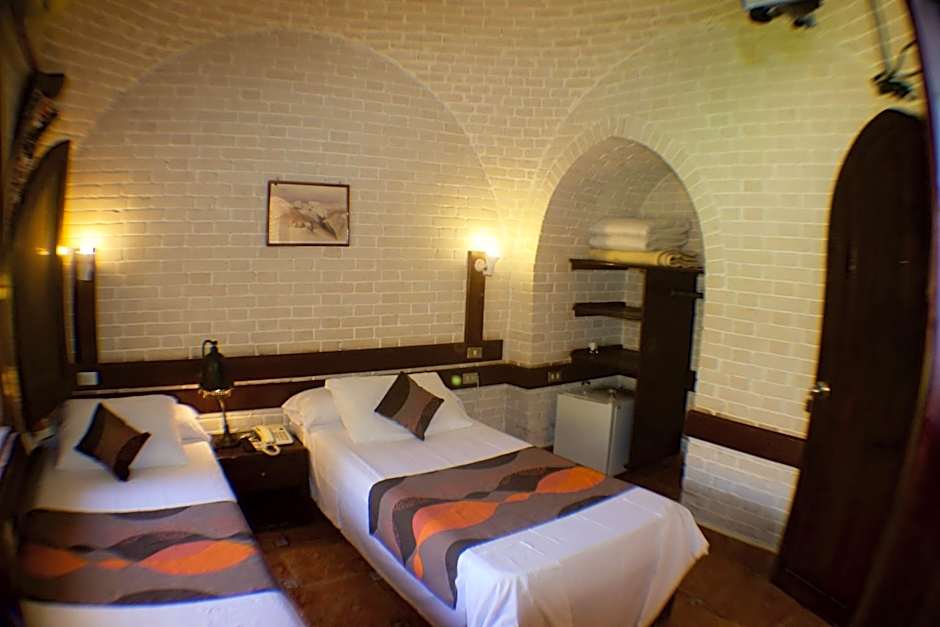 Air-conditioned room with marble flooring and stone walls. It includes a satellite TV, fridge, and bathroom. Rooms with garden view are available upon request.