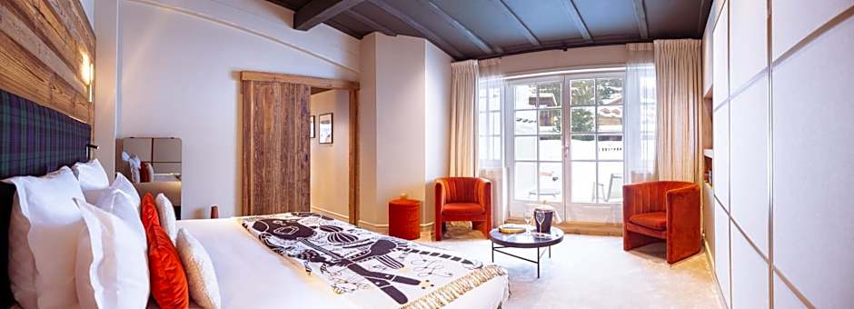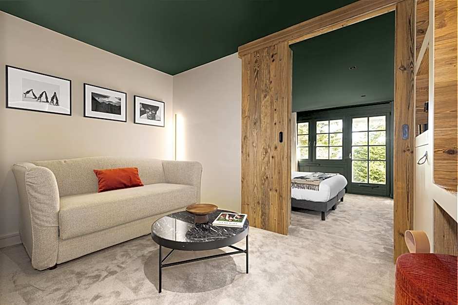 This duplex room has a separate seating area. The bedroom with a double bed and a single sofa bed is located on the mezzanine. It offers views of the valley.