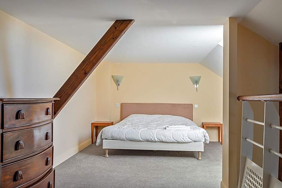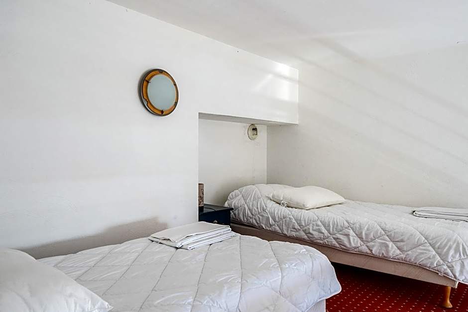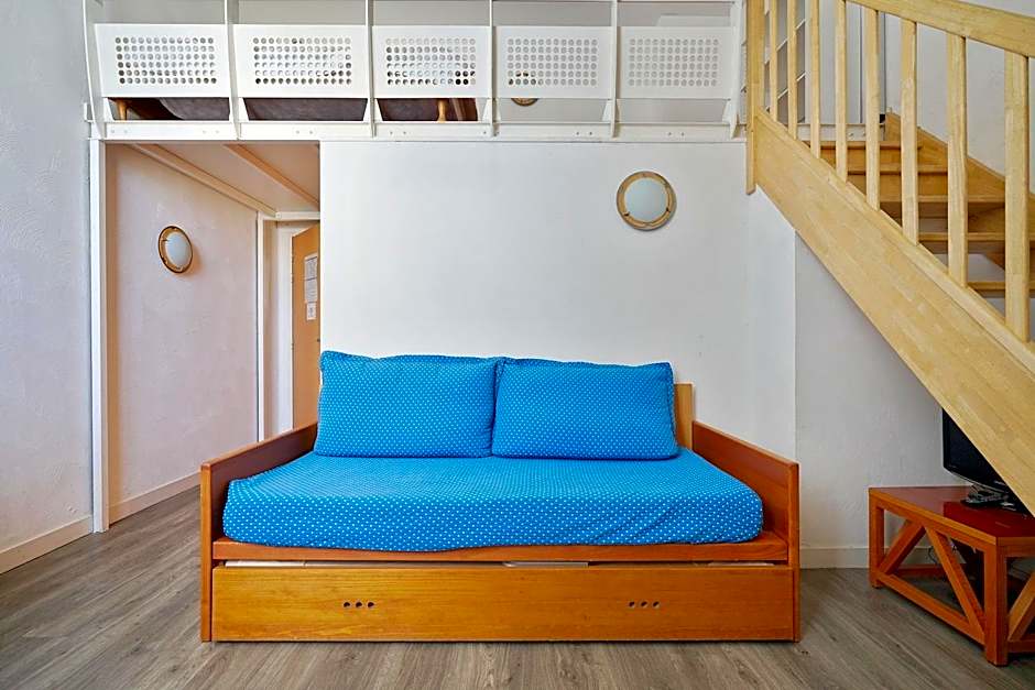 This apartment has is an open plan kitchen and living area. There is a pull-out bed and 2 mezzanine areas which overlook the living room. Each mezzanine has either 1 double bed or 2 single beds. The bathroom has a bath and a toilet.