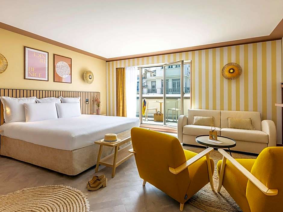 The Mercure Nice Centre Notre Dame hotel offers a variety of room types. They have Classic Twin rooms with two twin beds, Classic King rooms with a double bed and sofa bed, Privilege rooms with a queen-size bed, Junior Suites with a king-size bed and terrace, Privilege Double rooms with a terrace and view, and Classic Double rooms with a double bed. Smoking is not allowed in any of the rooms. The rooms range in size from 172 sqft to 388 sqft and can accommodate 2 adults, with some rooms able to accommodate additional children.