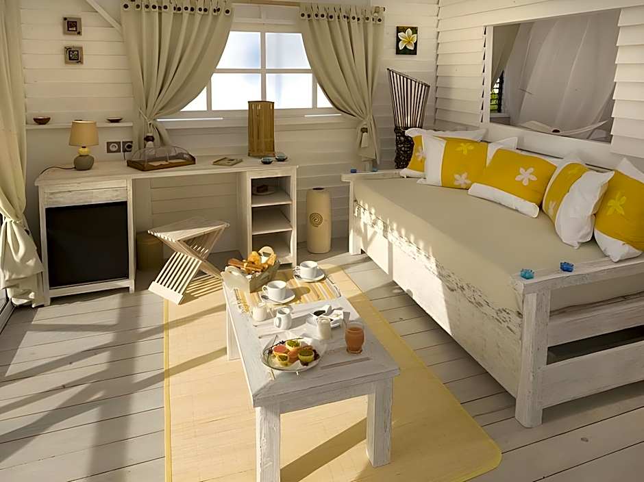 Has a separate bedroom with a four-poster bed. Comes with a deck and a separate living room. Features views of the ocean.