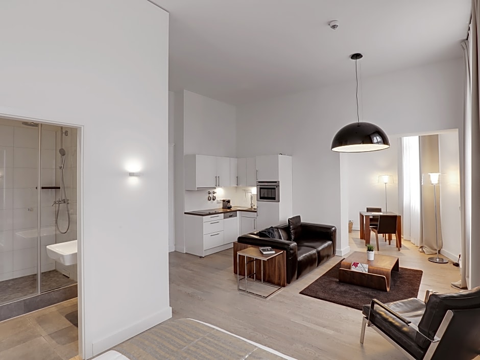 The premium suites feature oak parquet flooring, soundproofed windows, modern and stylish furnishings, a living room and a bedroom. The kitchen is fully equipped with high-quality furniture and oven, microwave and dishwasher. The modern bathroom comes with a rain shower, Italian tiles and designer sanitary fittings. A flat-screen TV with many international channels is provided.