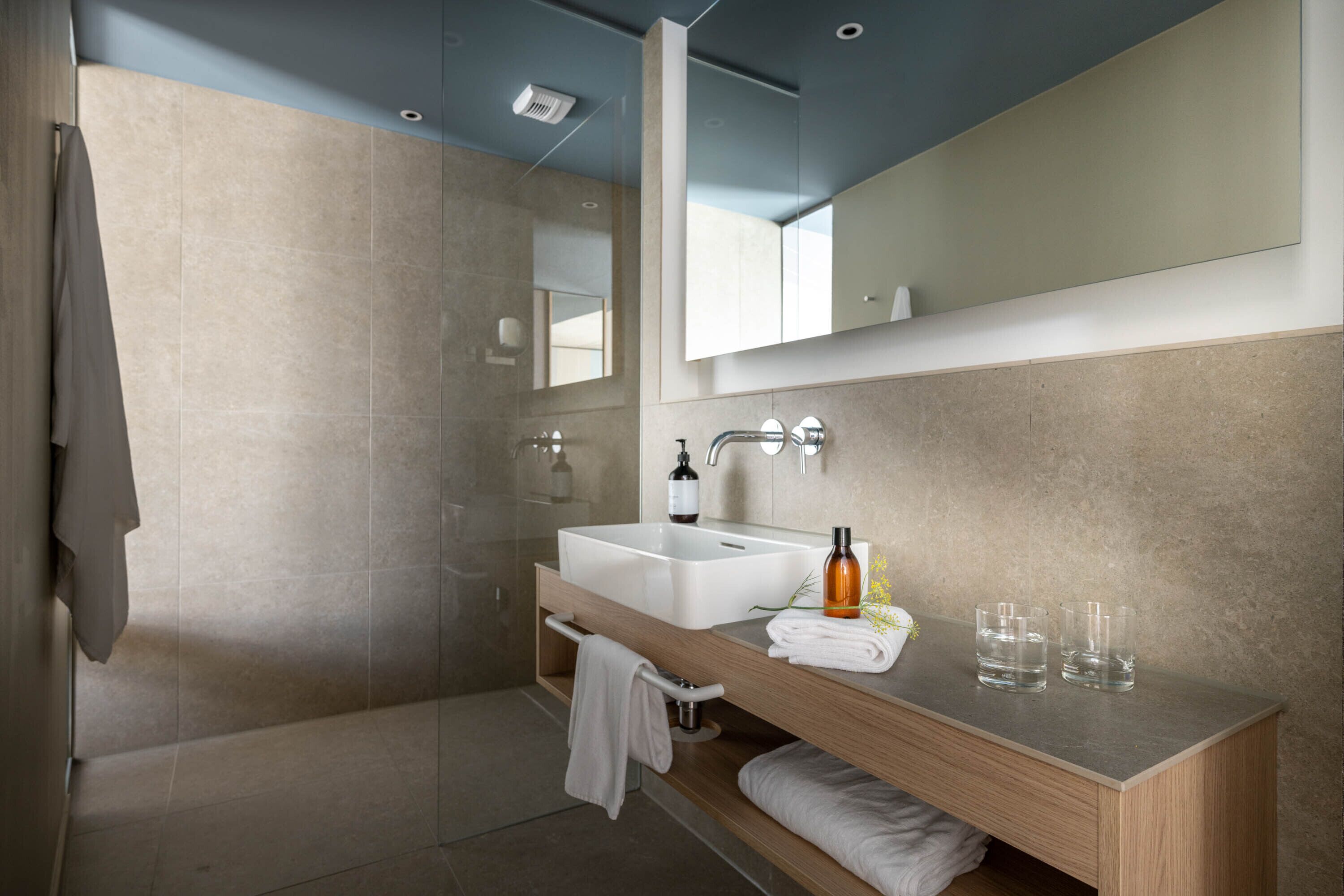 A very cozy double room with a comfortable sofa. Modernly furnished, with oiled oak furniture and white accents. Natural, local materials such as fine oak wood flooring or soft loden. High-quality box spring bed with a width of 79 in for best sleeping quality. With a fold-out armchair, this category offers space for up to three people.