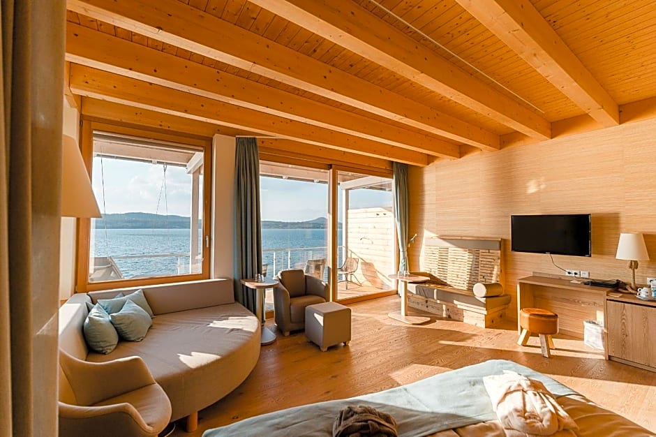 Located on the 3rd floor and directly overlooking the lake, this room features an infrared bench for relieving tension, a balcony with a relax hammock, a Austrian pine cushion for restful sleep, a walk-in rain shower facing the lake, a cozy seating area and floor heating.