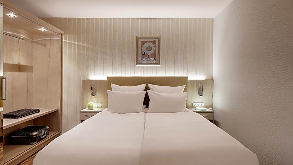 Room options span Comfort Double (291 sqft), Deluxe Double (323 sqft), and Premium Double (237 sqft), each non-smoking and accommodating 2 adults and 1 child with a queen-size bed. Also offered are Superior and Standard rooms (sizes not listed), plus Superior Single (215 sqft) with a twin bed; all options emphasize non-smoking layouts. Payment is accepted in cash or with Visa, Mastercard, American Express, Maestro, or EC-Card.