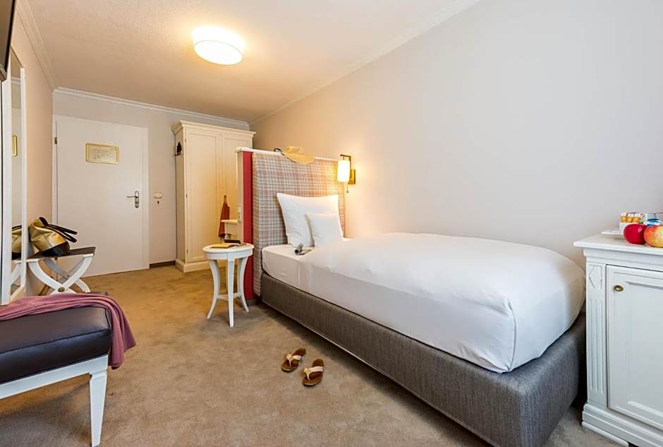 The hotel offers a variety of rooms including Romantic Double Rooms, Standard Double Rooms, Standard Single Rooms, Einzelzimmer Grand Lit for single occupancy, Double Rooms in the annex, and Business Double Rooms. All rooms are non-smoking and vary in size from 129 sqft to 538 sqft. The rooms can accommodate either 1 or 2 adults, with the option to add 1 child. The bed sizes range from Twin beds to Double beds.