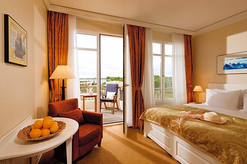 Spacious room in the main building with maritime-style décor offering a seating area, a flat-screen TV and a luxury bathroom. Also includes great Baltic Sea views.