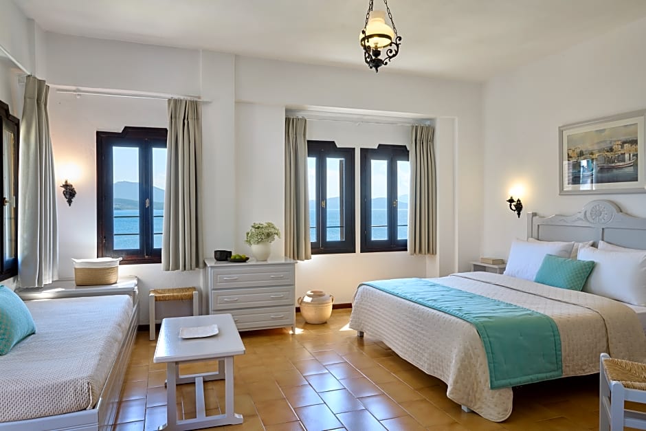Spacious 2-level villa with private pool and fireplace, 361 feet from the beach. It offers 2 double bedrooms and a living room with sleeping area, well-equipped kitchenette and dining area. Features balconies with sea views. 2 bathrooms are included. breakfast and dinner are served buffet style, lunch is served.
