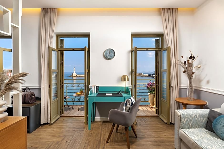 Room options span Deluxe, Sea View with Balcony; Deluxe, Twin, Sea View; Classic, 2 Twin; Suite, 1 Bedroom, Sea View; and more, with configurations that include balconies or terraces and views of the sea, mountains, or city landmarks. Each choice seems designed to pair with the property’s scenic surroundings, offering a varied and traveler-friendly lineup for a memorable stay in Chaniá.