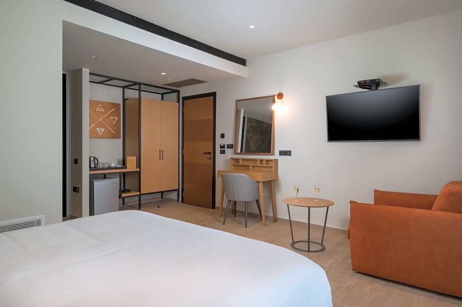 The Hyperion City Hotel & Spa offers several types of rooms. The Deluxe Double Room with Balcony and Double Room with Sea View are both double rooms that can accommodate 2 adults. They have a queen-size bed and do not allow smoking. The hotel also has suites, such as the Superior Suite with Sea View and Suite with Mountain View, which can accommodate 3 adults and may have a sofa bed in addition to a queen-size bed. Additionally, there are triple rooms with either city or sea views that can accommodate 3 adults and 1 child, offering a combination of a queen-size bed and a sofa bed. The rooms are all around 269-538 sqft in size.