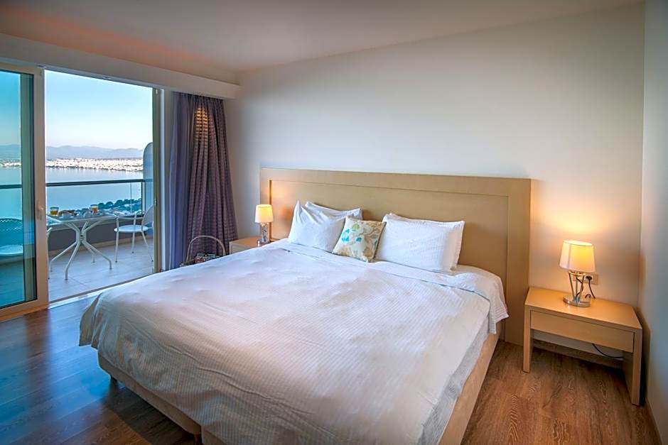 Located on upper floors, this spacious room opens out to a spacious balcony overlooking the Messinian Bay and the town of Kalamata. Facilities include: -satellite TV -safety box -mini-bar -bathrobes and slippers. Please note that this room type cannot accommodate an extra bed.