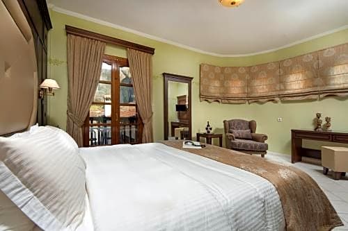 Room options span a range of configurations, from the Suite Panoramic, King, Meteora View (377 sqft) with a King bed and a sofa bed to accommodate up to four guests, to more compact choices like the Quadruple Room for two adults. Other offerings include the Triple Room (269 sqft) accommodating three adults and four children with a setup of four twins and one queen bed, a Dormitory Standard for single travelers, and family or apartment-style layouts for larger groups.