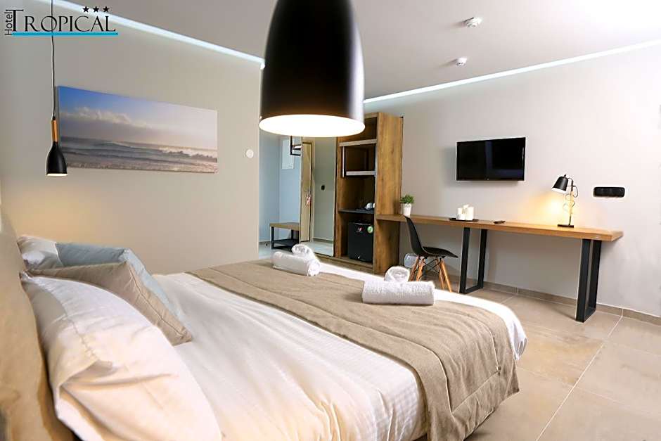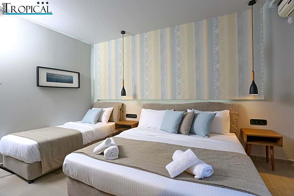 Unwind in your soundproof, air-conditioned room, where you can enjoy free toiletries and your own private balcony overlooking the lush garden. If you're traveling with the little ones, you'll be thrilled to know that kids’ meals are available too! So whether you’re looking to lounge on beach chairs, explore the stunning landscape, or simply relax in style, Tropical is your ideal retreat for an unforgettable Greek adventure.