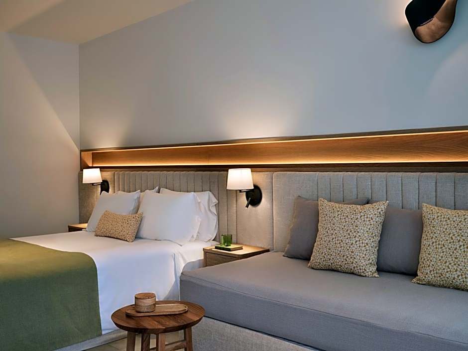 Featuring a private pool, this garden-view room is located on the ground floor and is fitted with a double bed, a single bed and an armchair.