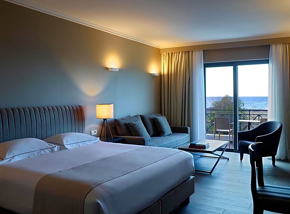 The Pelagos Suites Hotel & Spa offers a variety of rooms including Executive Suites, Family Suites, Villas, and Junior Suites, all non-smoking. Accommodating 2 adults and 1 child, these rooms feature beds suitable for couples or families. The room sizes range from standard studios to spacious suites, with bed options such as 1 king bed, double beds, or 2 beds, many offering pool or sea views.