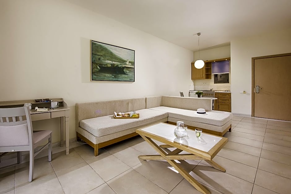 Step inside to discover elegant rooms equipped with free air conditioning and all the comforts you need after a day of exploration. For those craving relaxation, the spa and wellness packages, Turkish/Steam bath, sauna, and massage services beckon everyone to unwind in style. Dining at the on-site restaurant promises delicious Greek and international flavors, while live music and performances add a lively touch to your evenings. For sports lovers, try your hand on the tennis courts or explore the local waters with snorkeling (extra charges) just off the private beach.