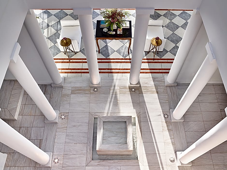 Main Residence, Sea View, 45-65m2. Possible to accommodate 2 adults and 1 child. The main residence offers just six exquisite sea view suites on the first floor: the Blue, the Orange, the Red, the White, the Green and the Rose Suites. These bespoke accommodations feature a mix of old-fashioned hospitality with modern amenities. Brocade wallpaper, velvet headboards on the king-sized bed in the master bedroom, a double-size armchair, raw silk bed covers, gilt bedside lamps, black-lacquered side tables, and a refinished antique writing desk, create a sumptuous retreat. The bathroom reveals double sinks set in marble and a bathtub inlaid with bronze-leaf and mother-of-pearl mosaic tiles.