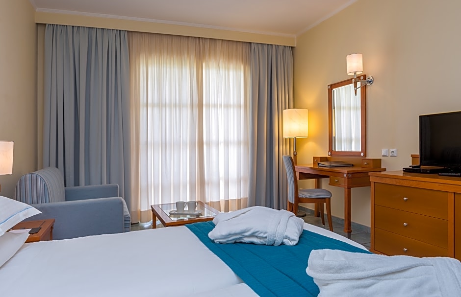 Sea View is 269 square feet and includes 2 single beds 80-130 width plus balcony, terrace, extra beds on demand, desk, satellite tv , hairdryer, tea and coffee making facilities , safe, bathrobes, and slippers.