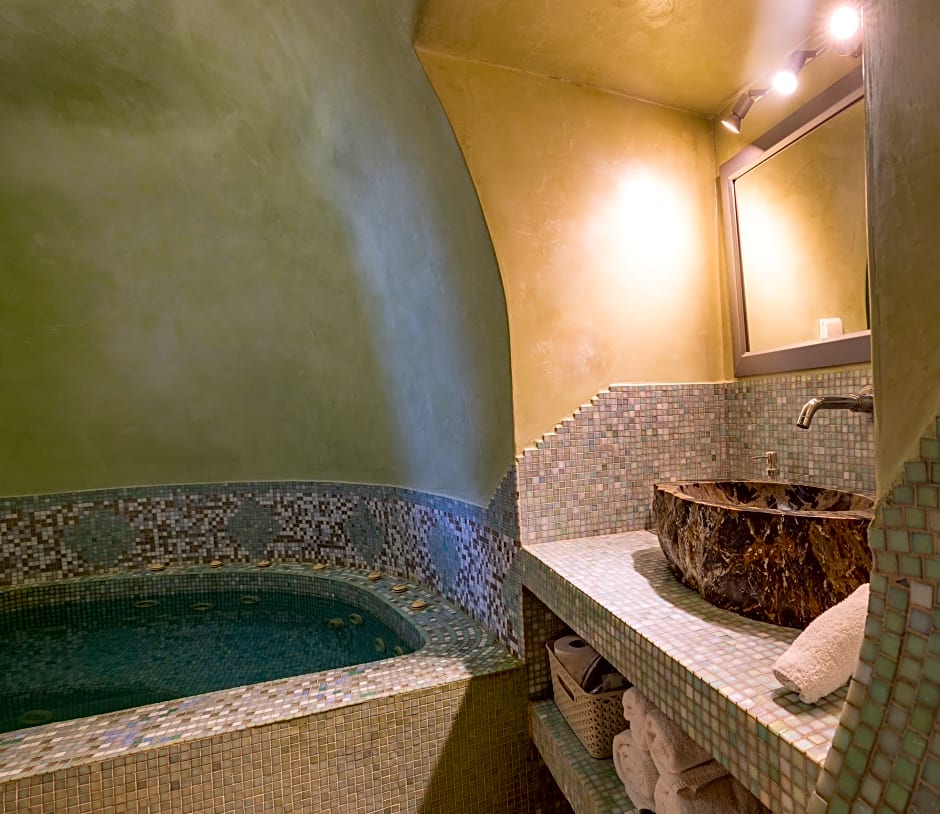 lagoon suite |caldera view, indoor private hot tub is 269 square feet and includes a king-size bed 150-183 width plus satellite tv , hairdryer, and safe.