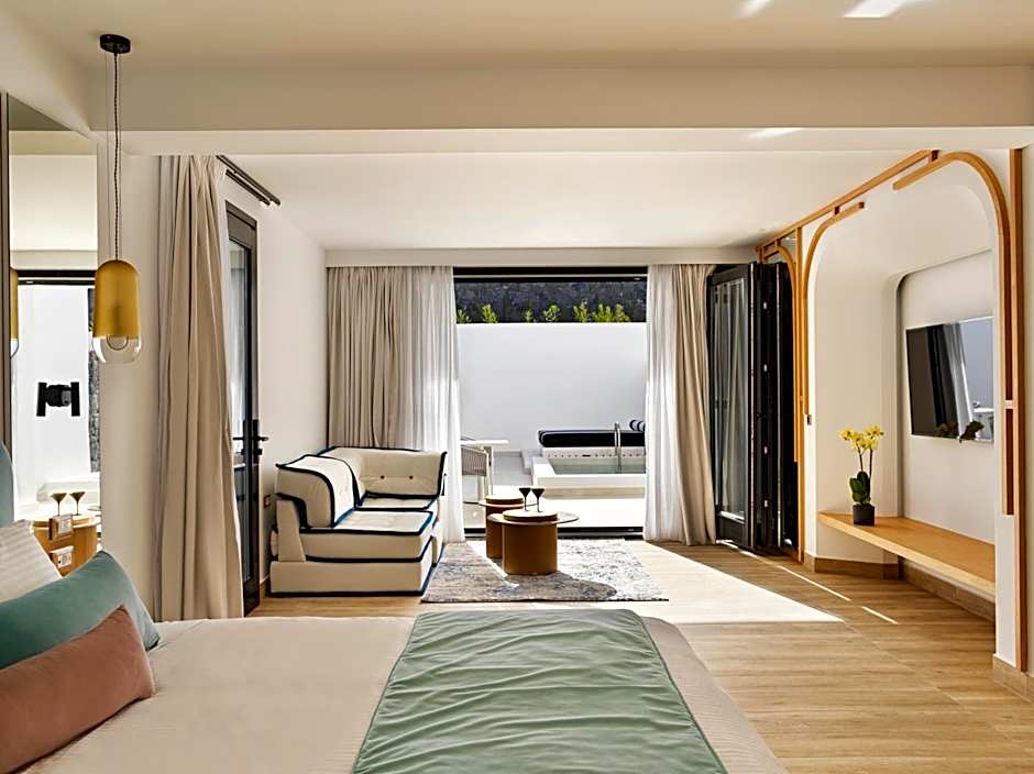 A range of suites caters to different tastes, including options like Suite, Sea View, Plunge Pool; Deluxe Suite, Sea View, Hot Tub; and Presidential Suite, Sea View. Other choices include Junior Suite, Courtyard View, Plunge Pool, and Suite with Sea View and Plunge Pool. Many suites accommodate 2 adults and 1 child, and several feature private entrances, non-smoking and soundproof rooms, along with amenities like private plunge pools, hot tubs, and sea views.