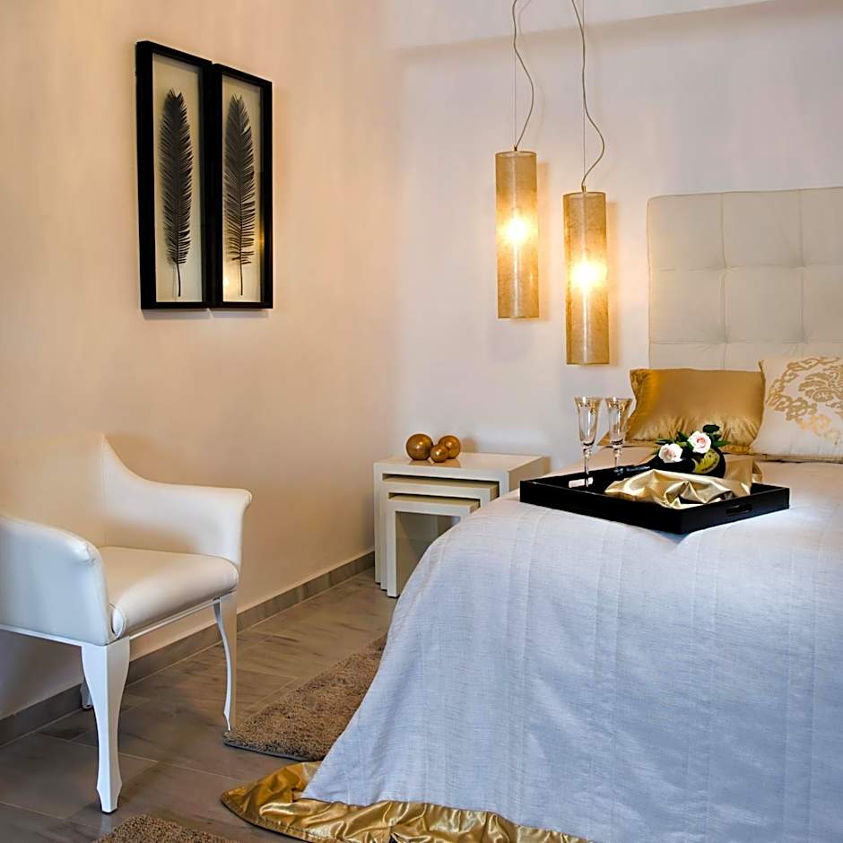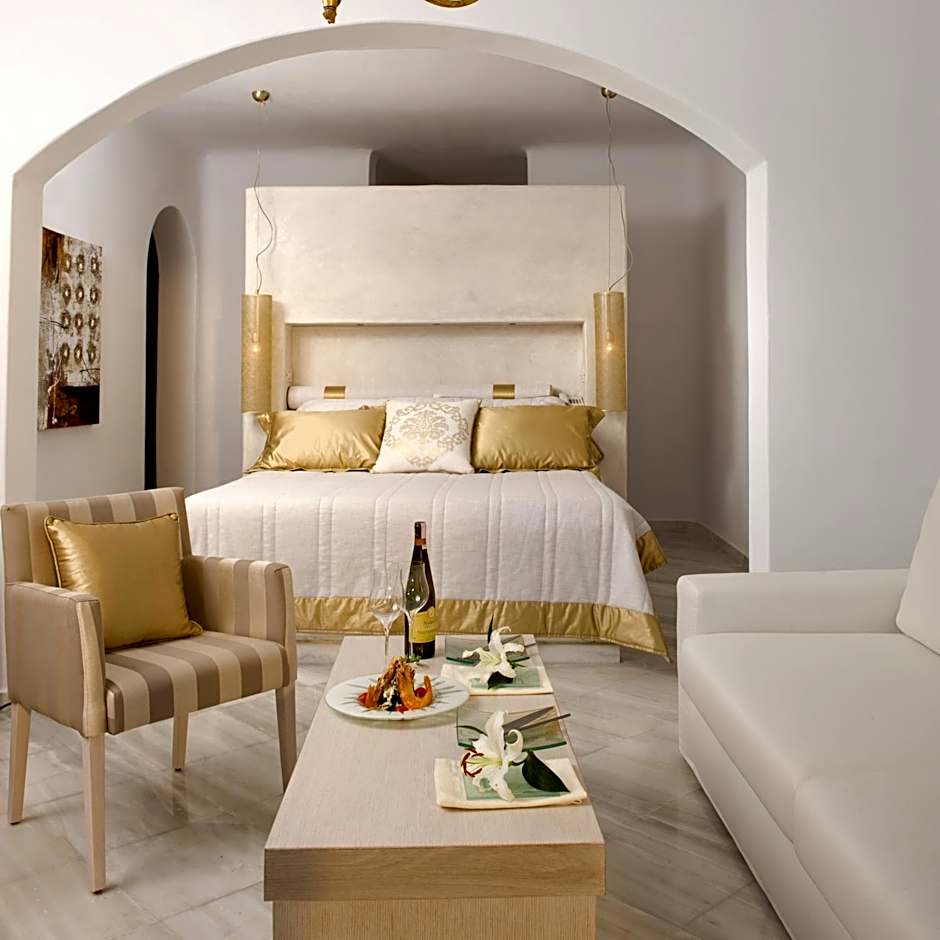 Spacious open-plan suite offering luxurious decoration and views to the caldera. It includes an open-plan bedroom with a king-size bed, and a bathroom with a rain shower.