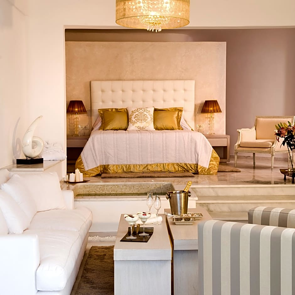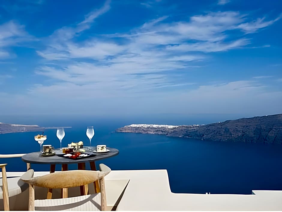 A stylish suite with outdoor, private, heated pool, a hot tub, elegant sun loungers and views of the Caldera. It includes an open-plan bedroom with king-size bed and living room, a bathroom with a rain shower and hammam, and a walk-in wardrobe.