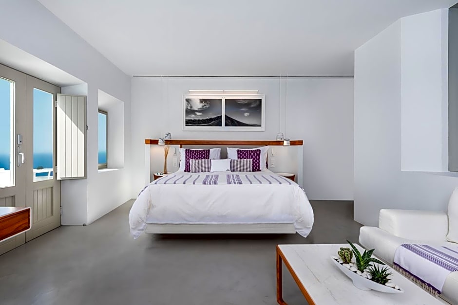 Grace Suite offers accommodations with glorious views over the Caldera and the Aegean sunset. Its terrace features comfortable sun loungers, a seating and dining arrangement, and an alluring private heated plunge pool. The suite includes a spacious master bedroom with a king-size bed, a Smart-System TV, and a comfortable seating area. An ultra-luxurious private bathroom features a steam bath and an interior heated plunge pool featuring views of the horizon. The interconnecting additional bedroom also features a king-size bed, a Smart-System TV, its own bathroom, spacious terrace, and a personal heated plunge pool.