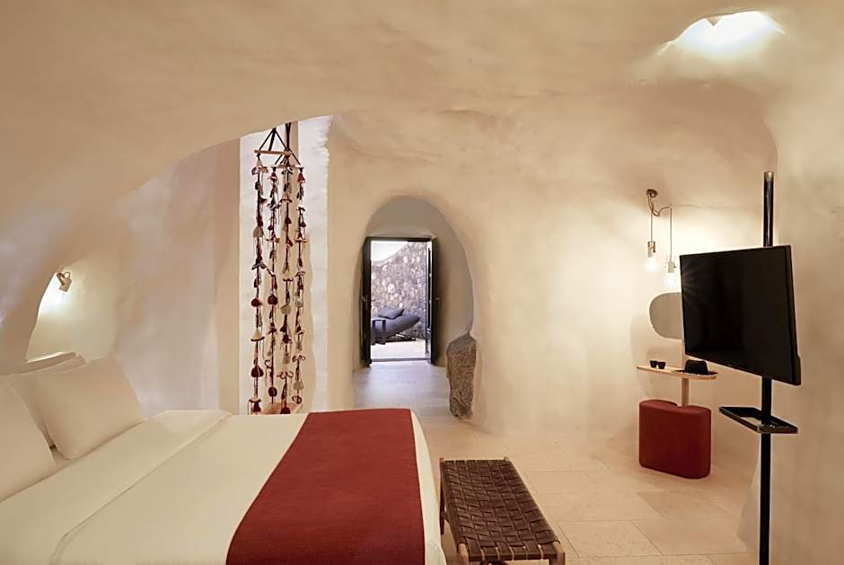 This cave-style suite has a built-in king-size bed and an impressive cage cellar to enjoy fine-labeled wines. It also features an open-air shower, luxury amenities, slippers, air conditioning, and complimentary WiFi. Its outdoor terrace with an inner courtyard view and a partial sea view features an outdoor private heated pool complete with jets for extra relaxation. It is equipped with outdoor furniture and a comfy double sunbed. Residents have also access to the main lounge area with the common infinity pool and pool bar.