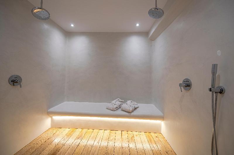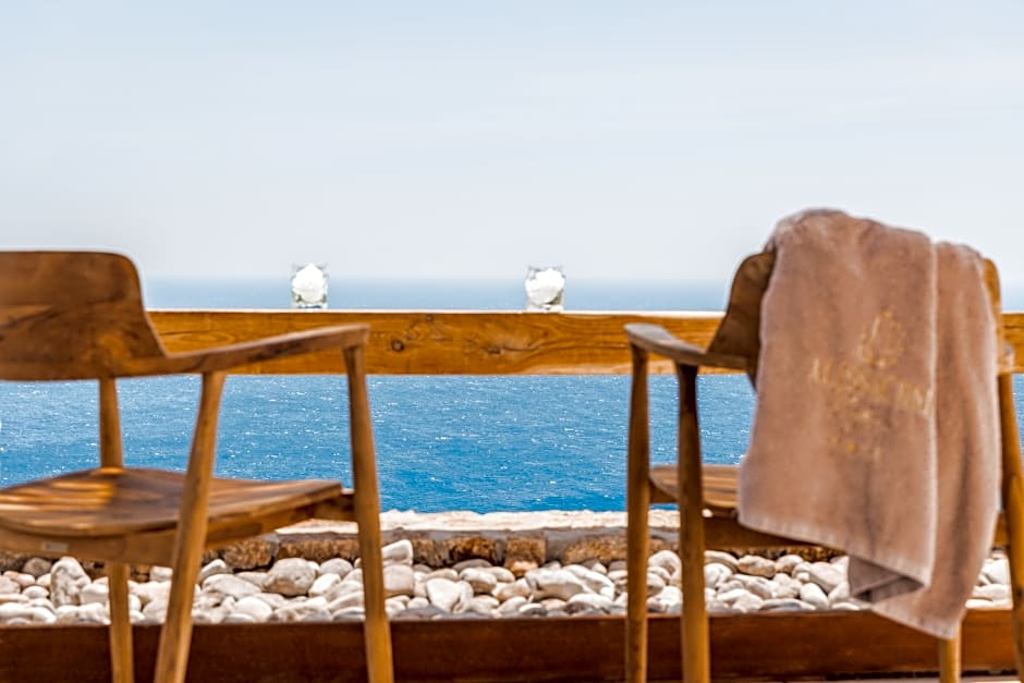 Dining choices are as stylish as the surroundings. The on-site Deli serves Greek, Italian, Mediterranean, Seafood, and Steakhouse fare in a Modern, Romantic setting, perfect for both casual lunches and evening dinners. After dark, evenings spark with local flair through live music performances, while features such as a private entrance and beach chairs/loungers enhance the relaxed, seaside vibe along Psarou’s shore.