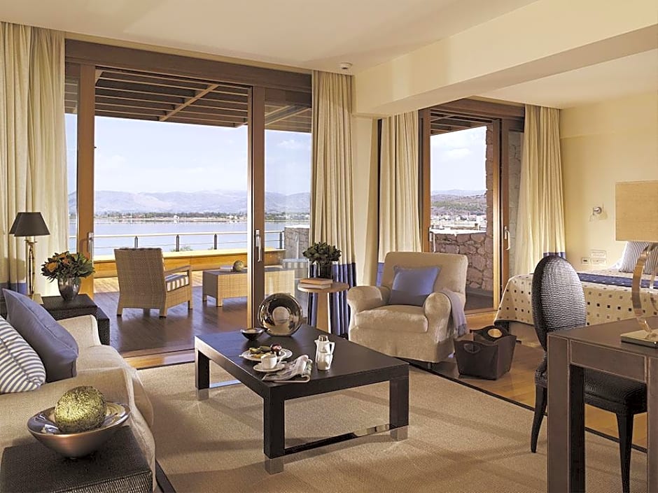 This elegant two-bedroom accommodations offers a view of the bay and the Bourtzi isle, with two private balconies. It consists of a luxury room with sitting area and writing desk, a marble‐lined bathroom with aerospa bathtub and a second room with bathroom featuring shower cabin with hydro‐jets. These air‐conditioned rooms feature LCD Satellite TV, mini bar, hairdryer, bathrobes, slippers and toiletries.